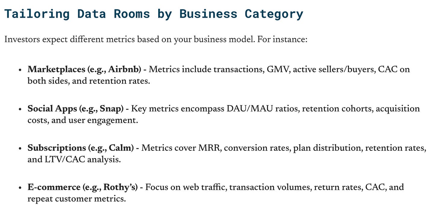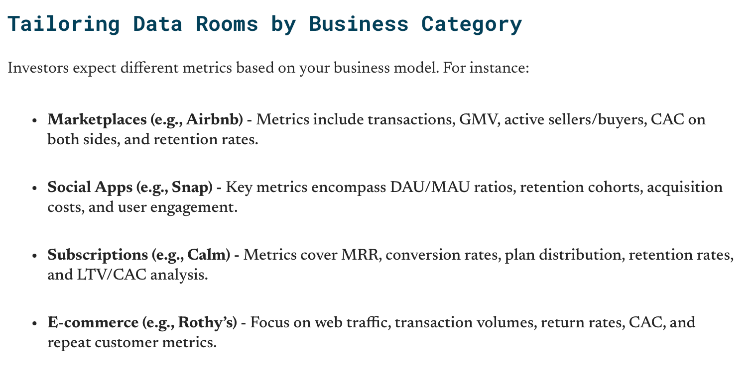 STV Take: The above image highlights specific metrics investors might care about depending on the type of business being built. There is not necessarily a “right way” to build a data room; investors will have slightly different things they look for depending on stage and type of business, which I think is why there is some mystery around what exactly to include.