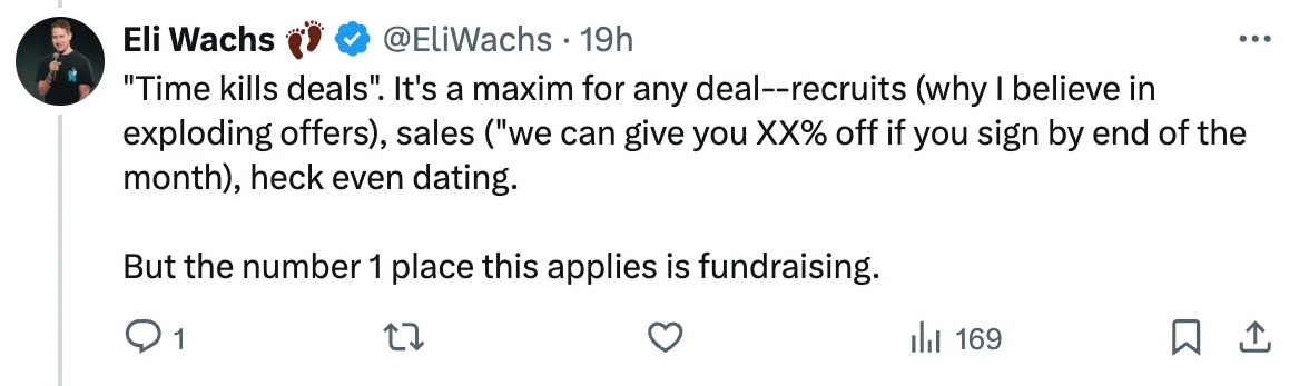STV Take: I am skeptical of many X threads, but this one is an exception to a lot of the noise. Getting an investor to believe in the business and write the first term sheet is the hardest part of fundraising, but once it has been secured, the optics around the business change. Suddenly, it has validation and has been derisked to a certain degree. While a term sheet can be useful to getting investors to commit, it isn’t the only way. As Eli mentions, having great metrics is the ultimate way to instill confidence in the business. This is a good reminder that despite all of the psychology around successfully fundraising, the best unlock for securing investment is to be building a great business. Admittedly, that can be hard to demonstrate at the earliest stages, which is why any amount of derisking that can be done is beneficial to securing investment.