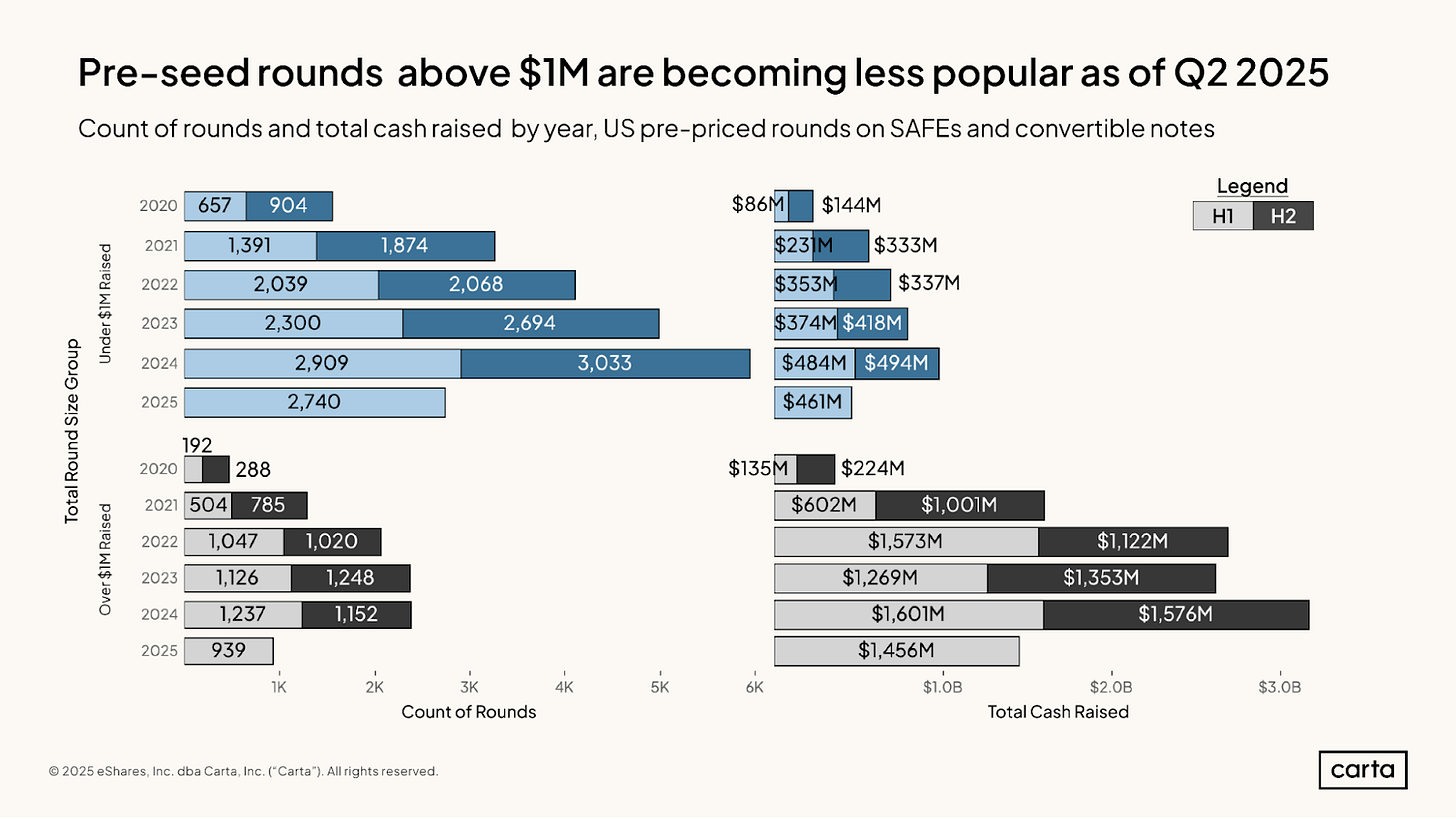 STV Take: The chart showing the decline in $1M+ Pre-seed rounds is striking, and I think there are a few possible explanations. One is that many companies raised larger Pre-seed rounds in 2023 but struggled to convert those into successful Seed raises in late 2024, possibly fueling some caution around overcapitalizing too early. Founders and investors may be rethinking whether bigger is actually better at this stage.