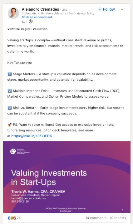 On LinkedIn, Alejandro Cremades shared a link to a presentation by Mercer Capital that discusses what goes into determining a startup’s value. While the linked presentation is several years old, it’s still a good resource for founders looking to understand the various nuances that go into valuing a company. For Alejandro, the three key takeaways from the report are the following: